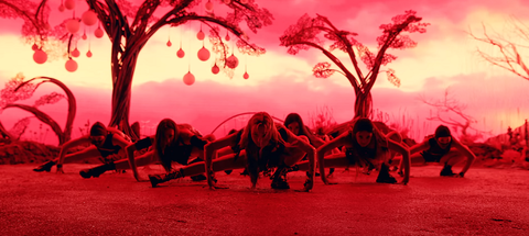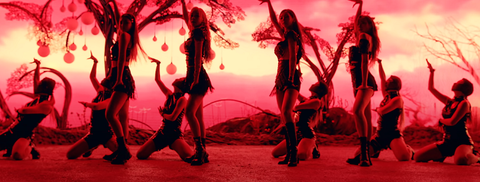 그리고 장윤주님 장면 끝나자마자 단체 안무 있는데그 전에는 없었던 올 빨강으로 1초간 유지.(먹혔다는 걸 확실하게 암시)(세상이 피로 물들었다)이미.. 전부 어둠으로 먹혀버린 상황을 암시하는 장면시작은 평화 (파랑: 평화 상징)