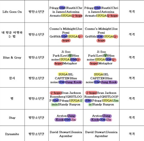방탄 이번 앨범 멤버 작곡 작사 참여도 엄청 높다 ㅠㅠㅠ RM은 dynamite 빼고 다 들어가있음 ! 이번 뮤비는 정국이가 직접 찍었어