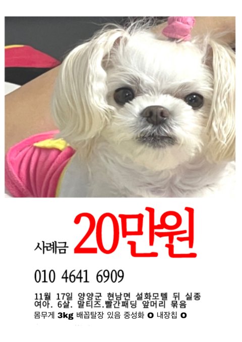 혹시나 지나다니시다가 강아지를 보시거나, 이 강아지를 데리고 계신 경우에 사진에 있는 번호로 연락 한번만 부탁드립니다.