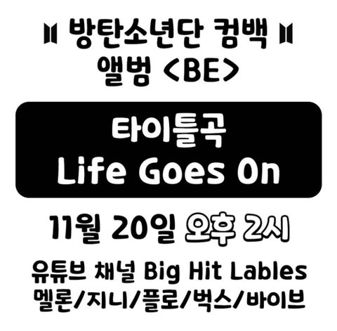 방탄소년단이 11월 20일 (금) ⭐오후 2시⭐ 새 앨범 "BE"로 돌아옵니다 !