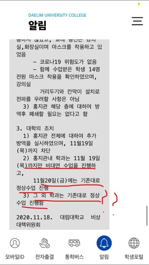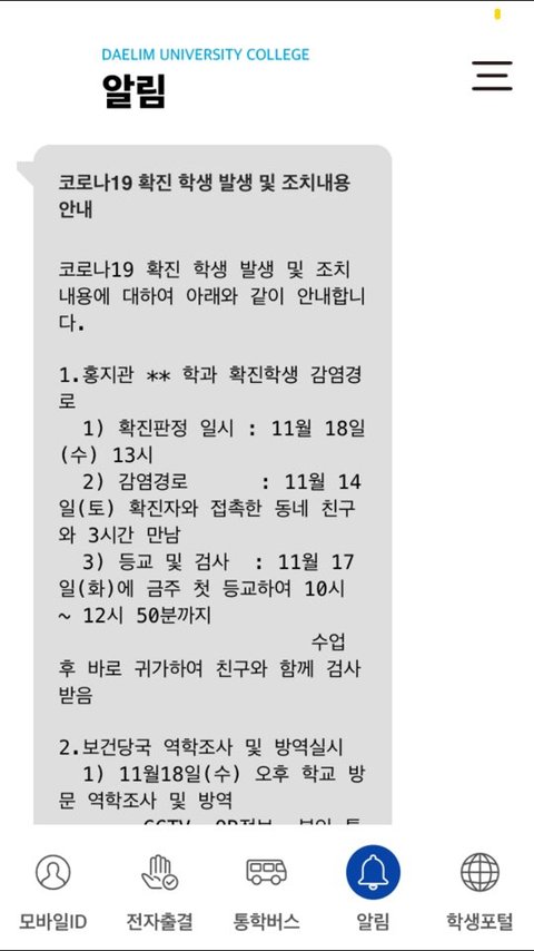 1. 어제 11월 18일 대림대학교 홍지관 00과에 17일 등교한 학생이 확진이라는 연락이 왔음