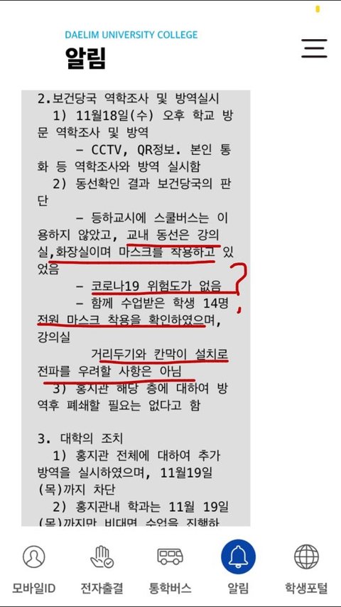 4. 왜 이렇게까지 들고일어나는거냐면 심지어 대림대학교에서 지금까지 코로나 확진자가 5명이 나왔었음 근데 학생들한테 어떤 공지도 1도 안해주고 에브리타임 커뮤니티에서 누가 발설해서 학생들이 알게됐음 학교 측에서는 난리가 나니까 그제서야 말해줌 당연히 학생들이 물어보기 전에 말해야 하는거 아님?