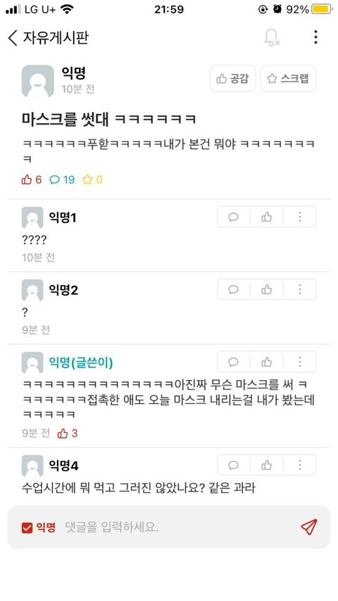 내 동생은 수업듣다가 오후 3시쯤에 학교에서 확진자 왔다갔으니까 홍지관 폐쇄한다고