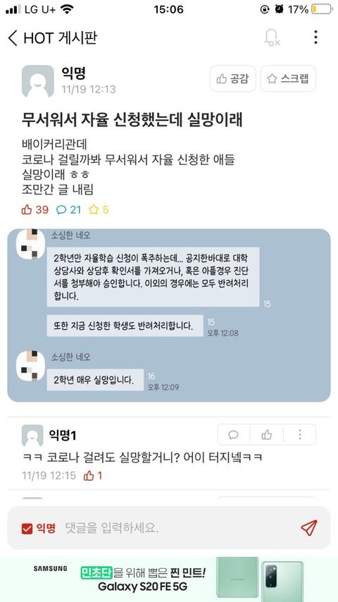 그리고 나서 자율학습신청제도를 바꿔버림 신청하려면 학교에 있는 상담사랑 상담하고 정신과에가서 코로나 우울증 확인서를 받아와야함 사실상 그냥 이 제도 사용하지 말라는거지