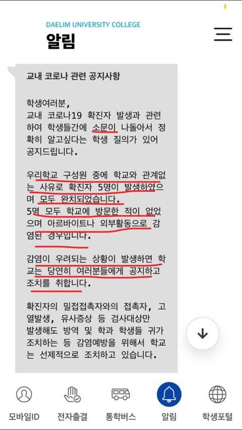 몇일이 지나서 학교 내 여론이 잠잠해지면 다시 대면으로 돌리거나 학생들에게 말도 안되는 것들을 강요하겠지 확진자가 또 나오면 대림대학교에서 학생들이랑 학생들 가족은 책임 져줄거임?