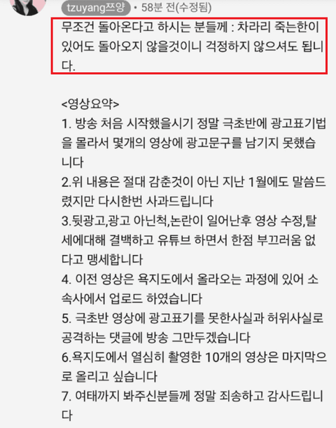큰잘못한거도 아니고 돌아온거 환영함 근데 쯔양이 해둔 말이 있어서... 좀 웃긴건 어쩔 수 없음 ㄹㅇㅋㅋㅋㅋㅋ
