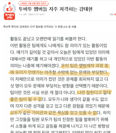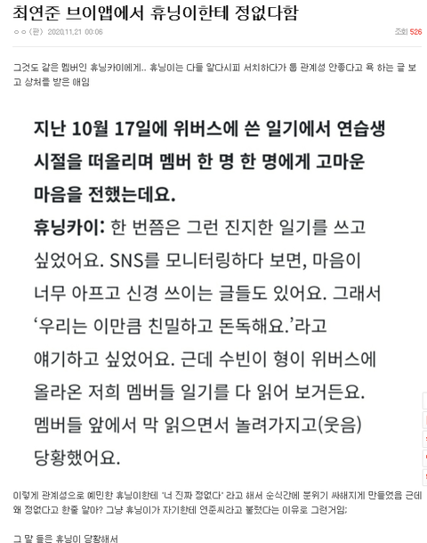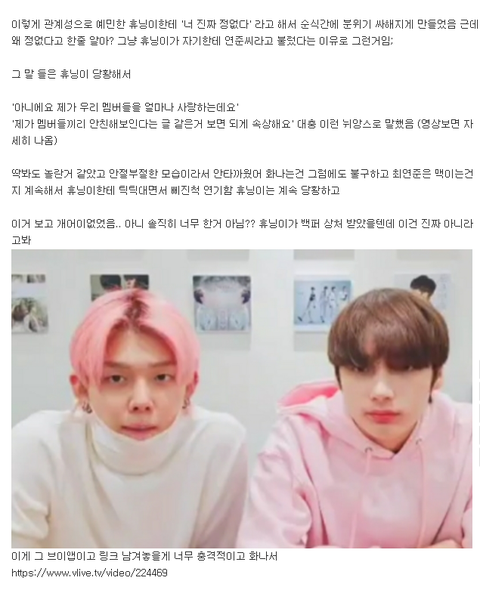 저거 갑자기 올린것도 휴닝이랑 연준이 관계성 요즘 흥하고 톡선 오르니까 질투해서 이간질글 올린거 백퍼임 범규랑 엮인 관계성은 연준이랑 흥해야하는데 연준이가 다른 멤버들이랑 더 친해보이는것 같으니까