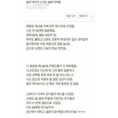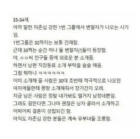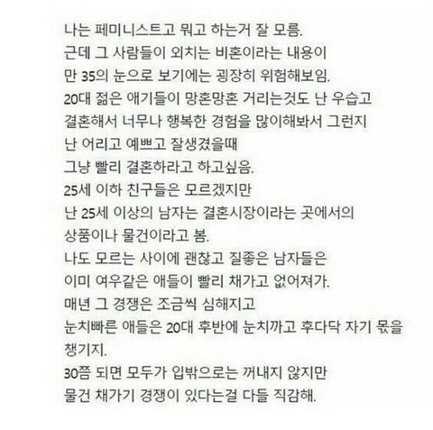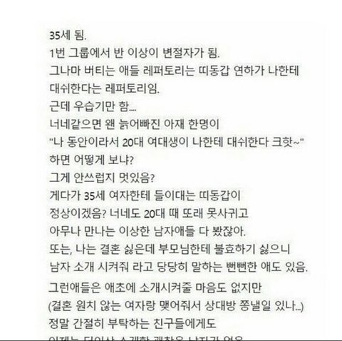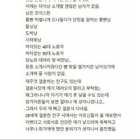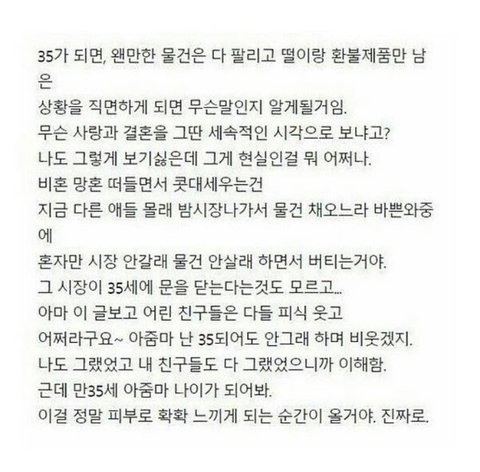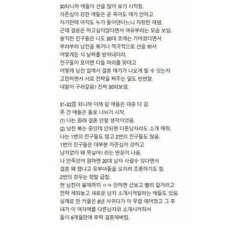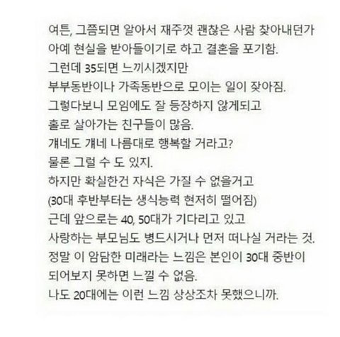 모든 사람이 다 저사람이 말한것처럼 똑같이 느끼는게 아님 정해진대로 사는것도 아니곸ㅋㅋㅋㅋ결혼 후 우울증, 자식낳고 다 기른후에 우울증 오는 사람들도 많고 다양한데 이건 그냥 봐도 후려치는글임ㅋ짤 닳겠네ㅋㅋㅋㅋㅋ