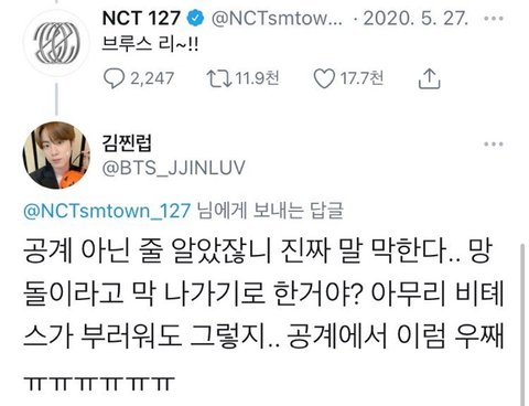 어떤 아미가 방탄 좋아하는 공계로 비티에서 어쩌고 로고 다 박고 엔시티 사진 찍어서 올림.