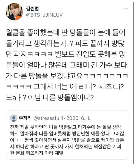 얘 한명이면 말도 안해 ㅠㅠ 허구헌날 울 오빠는 빌보드 울 오빠는 그래미 하면서 다른 가수들 노력 폄하하고 세븐틴, 엔시티 , 투바투 등등 잘나가는 가수들까지 망돌이라며 깎아 내리기 바쁨. 이러면서 아미들이 가장 불쌍하다며 지들끼리 부둥부둥.. 토나온다 ㅋㅋ