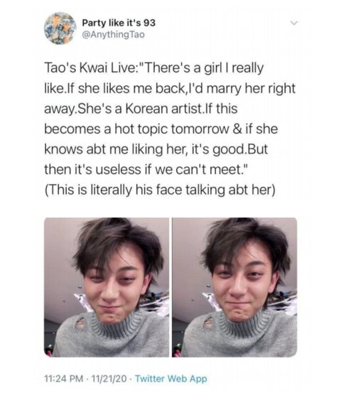 이거는 타오가 라이브에서 아이유 언급한 내용인데 조금 내용이 이상해 망상같아 팬들 앞에서 저렇게 얘기한다는거 자체도 조금 이상하고 인정해달라는거 같기도 하고 찝찝해
