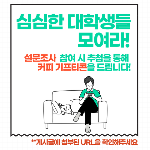 연구에 참여한 대상자들 중 추첨을 통하여 소정의 모바일 쿠폰을 받으실 수 있으니 성실한 답변 부탁드립니다!! 감사합니다.