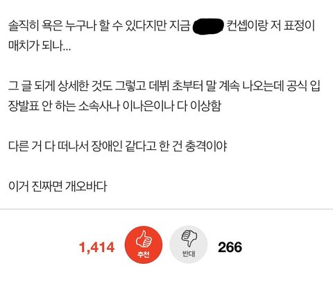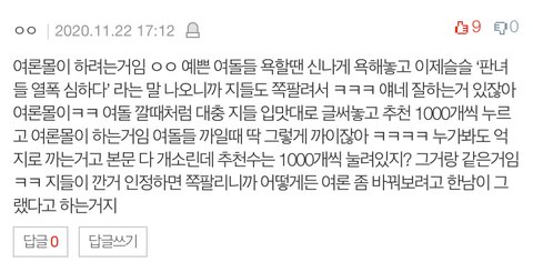 오늘 톡선에서 판에 올라오는 아이돌 까글을 남초에서 몰려와서 주작한거라는 개소리들 하던데 니네 양심 없음...? 여초인 네이트판에서 맨날 올라오는 까글이 싹다 한남들이 주작해서 올린거라고? 그럼 저 글에 눌린 추천수 몇천개도 싹다 한남이 누른거라고? ㅋㅋㅋㅋㅋ 한남 까는건 상관없는데 제발 니들이 여돌 패놓고 그거 책임전가는 하지마 ㅋㅋ 진짜 ㅈㄴ 웃겨 우길걸 우겨야지