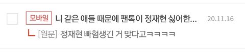 나도 묘하게 비꼬거나 은근 돌려까는 글들 다 반대 누르고 댓글로 뭐라 하고 다니는데 마치 팬톡 전체 즈니들이 ㅈㅎ이 싫어하는 것처럼 말하면 할 말이 없음 솔직히 정상 시즈니면 걜 어떻게 싫어해ㅋㅋ.. 이상한 애들 뭐라 하고 다니다가도 팬톡 얘 배척하잖아~ 이런 말 들으면 진이 확 빠짐 아니라고 몇 번을 말해야되냐