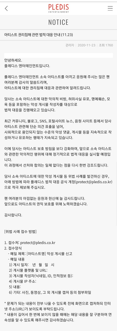 플레디스 법적 대응 공식 계정 protect@pledis.co.kr