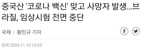 속보) 중국산 코로나백신 브라질에서 효과입증