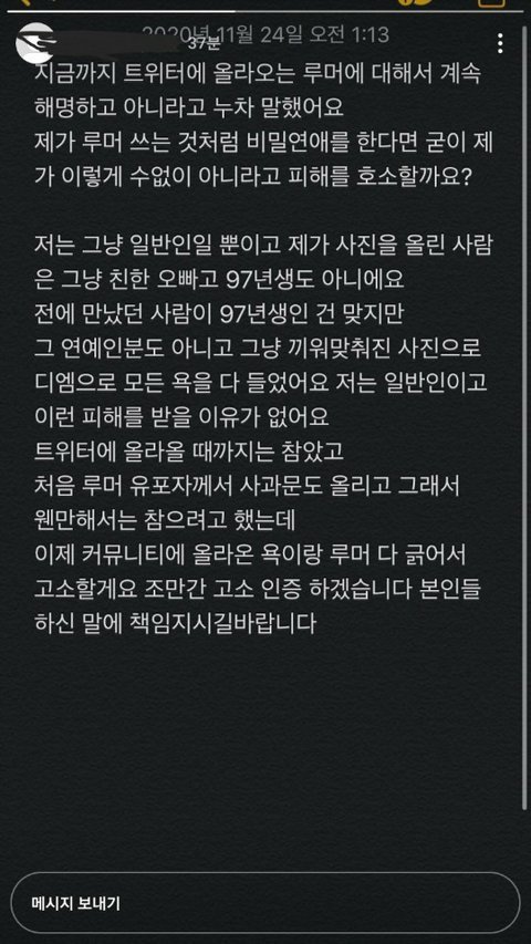 결국 그분이 참다참다 해명글 올리고 일반인 사진도 다른 남사친인거 인증하고 고소한다하고 내일 바로 경찰서가신다함