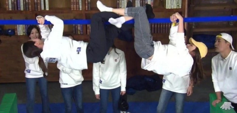 게스트들이 철봉 게임 잘 할 수 있게 잡아주고 도와줌