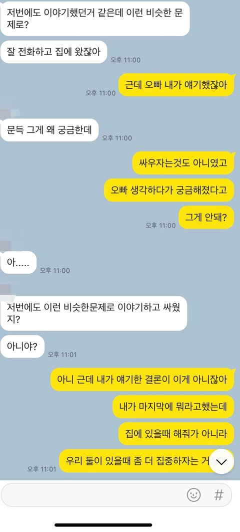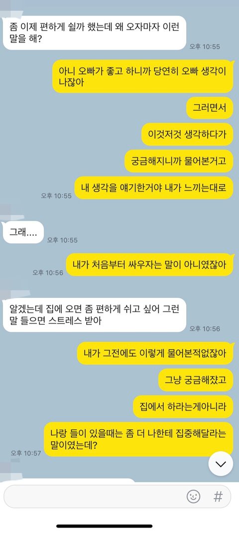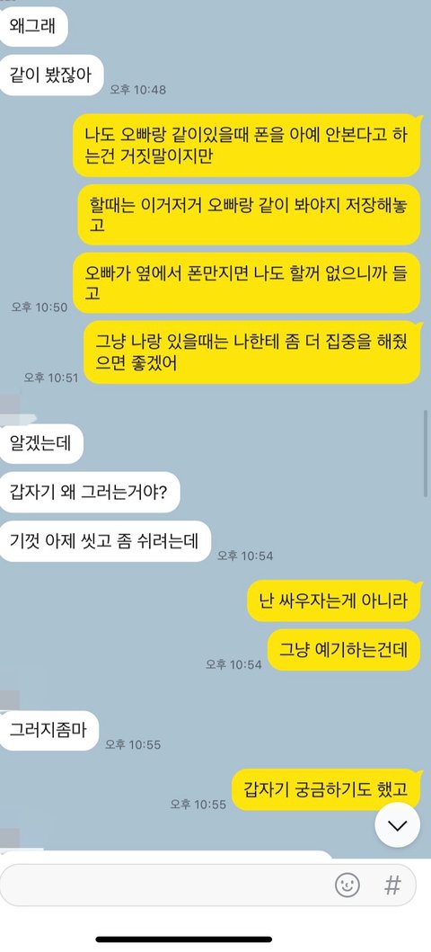 여자분이 시비조라는 댓글있는데 막 그렇게 시비조라기보단 그냥 참다가 말했을때 충분히 선지켜서 나올만한 말투라 생각함 그냥 남자친구분은 여자친구의 지적에도 그냥 그말자체가 듣기싫고 해결에도 관심없으신거같은데 그리고 만났을땐 폰보고 집에선 연락안보고 그이유로 싸우신거아닌가요? 애초에 이런거면 남자분은 마음이 식었다고 보는게 맞는거같아요