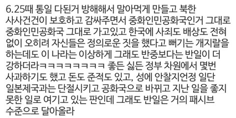난 정부가 주도해서 반일감정 심으려 하는게 너무 꼴보기 싫어서 반발감 생김. 과거에 잘못해놓고 사과 안하고 우리나라에 피해주는건 일본보다 북한이 더 심한데 북한은 한민족이라고 바보같이 퍼주면서 맨날 당하고 일본 앞에서만 위풍당당ㅋㅋㅋㅋ 사실 위풍당당도 아님 그러는척 하는거지