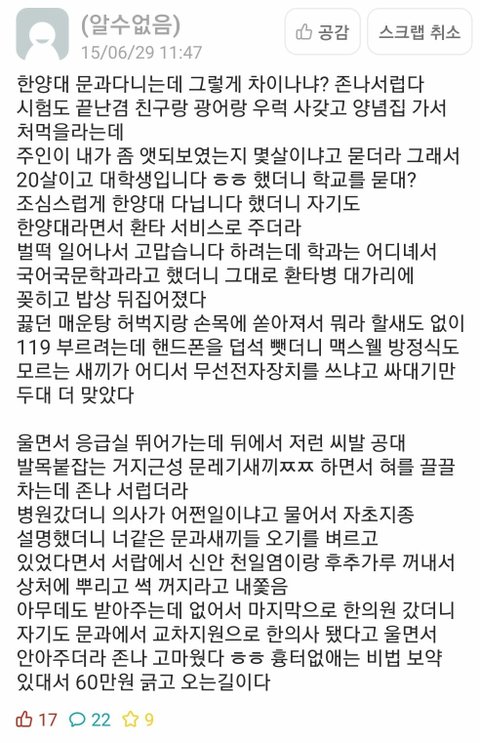 댓글 왤케 진지함..? 걍 자조적으로 드립치는 거잖아... 누가 이거 보고 진지하게 문과는 개병.신이고 이과가 짱짱맨이다라고 생각하겠어ㅋㅋㅋ 게다가 5년 전 글인디