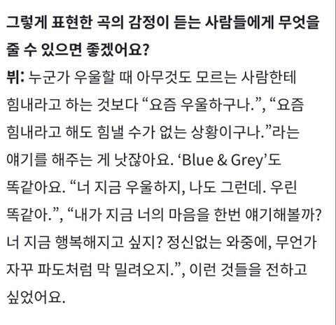 뷔: 팬들한테 제 모습을 보여주지 못하는 건 더 이상 아쉽지 않아요. 안전하게 아미들을 볼 수만 있으면 돼요. 이젠 그때까지는 기다릴 수 있을 것 같아요.