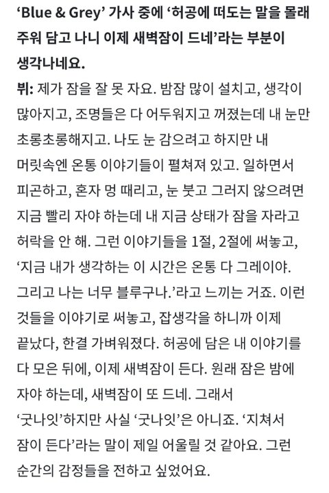 뷔: 어... 모르겠어요. 첫 번째 믹스테이프잖아요. 그래서 부담이 엄청 많이 돼요. ‘어떻게 하면 내가 만족할 수 있는 앨범이 될까?’라는 생각을 되게 많이 하고 있어요. 타이틀 곡도 타이틀 곡인데, 주위 사람들은 “이대로 넣어도 돼.”라고 얘기하지만 자꾸 뭔가 더 집어넣으려는 욕심이 많이 생기네요.