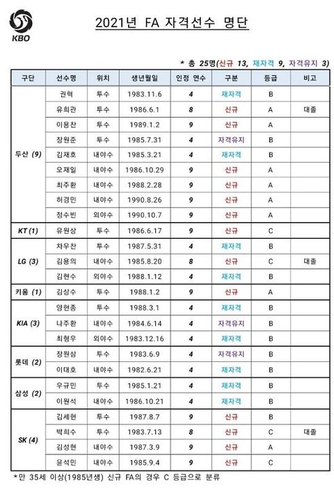 KBO(총재 정운찬)는 25일 2021년 FA 자격 선수 명단을 공시했다.