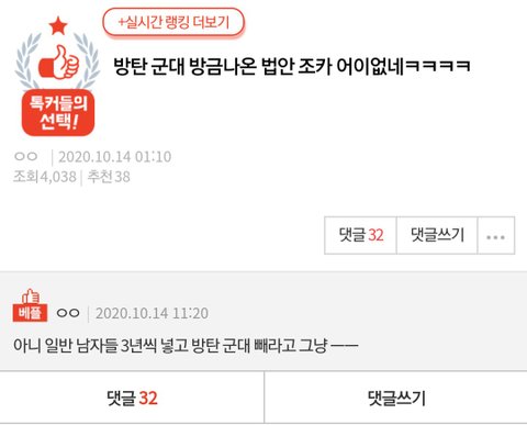대마초나 피다 걸리고 해외 텅텅콘한 지디 같은 놈이 뭐라고 지디도 군대갔는데 타령이야 ㅋㅋㅋㅋㅋㅋ 그새끼는 군대가서도 황제 군생활하다 걸려놓고 약국빠들 군면제 얘기마다 그만좀 나대 ㅋㅋㅋㅋㅋㅋㅋㅋㅋ
