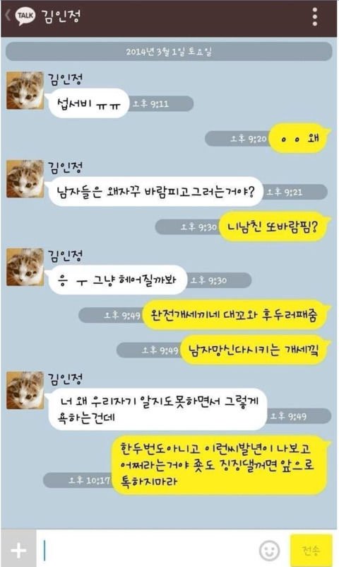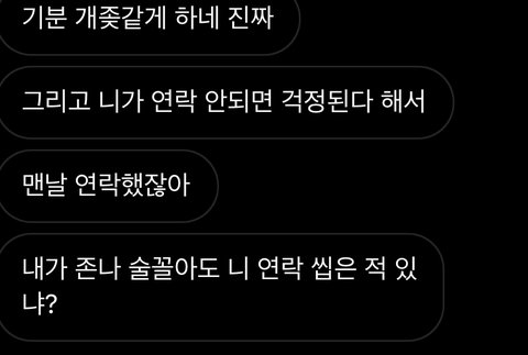 얘가 ㅈㄴ 저저번주에 일주일내내 술쳐마시고 나한테 주정부려서 한번 뭐라 했었거든 근데 또 내일 친구 생일이라서 술마신다는 거임; 그래서 이걸로 개싸움 원래 우리 싸울때 말 개심하게 하긴 하는데 이거 ㅈㄴ 너무하지 않냐 ㅠ 이건 ㅈㄴ 일부임
