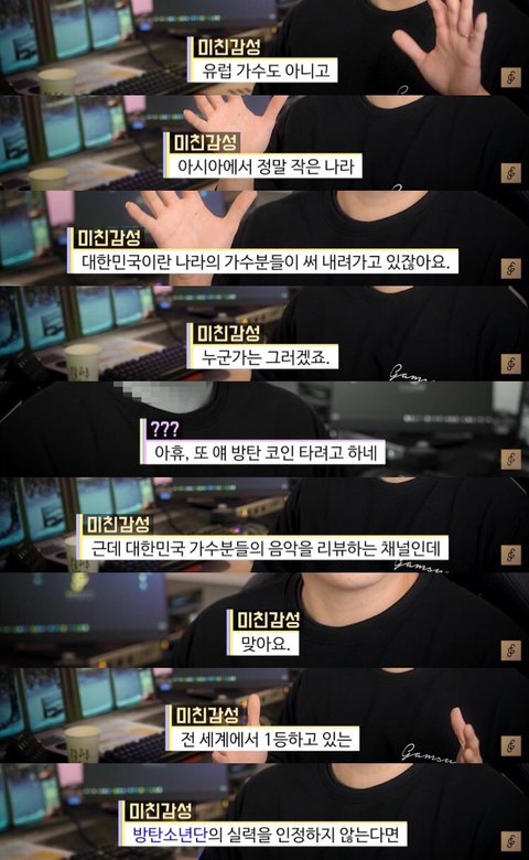 ㅅㄹㅃ 사회 부적응자 같은 놈 ㅋㅋㅋㅋ 걔 영상에 반응다는 놈들이나 그 놈이나 ㅋㅋ 전문가들과 전세계인들과 다 알법한 해외아티스트들도 다 인정했구만 ㅋㅋ 방구석 워리어들 방구석에서 난리칠때 방탄은 그래미까지 감 제발 정신차려