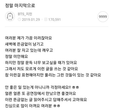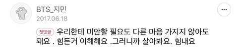 가끔 감정이 밀려와서 공카에 글을 쓸 때, 아미들이 걱정하니까 이렇게 말해준거 ㅠㅠㅠ 이때도 미안하다는 말을 빼놓지 않고 ㅠㅠㅠ