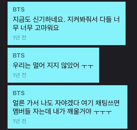 방탄이 처음으로 빌보드 갔다오고 막 상도 받고 차트에도 오르니까, 트위터나 브이앱 채팅, 등등에 막 방탄이랑 멀어진거 같다고, 너무 먼 존재 같다고 얘기하니까 난 그렇게 안 느끼는데, 미안하다고, 더 잘하겠다고 지켜봐 달라고 해주고, 이말하면서도 자는 멤버들, 아미 깨울까봐 조심하고..