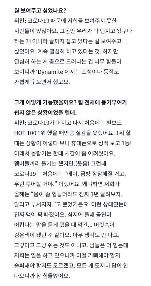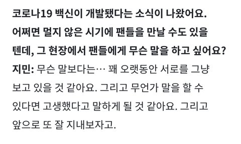 몇일 전 인터뷰인데, 코로나 백신이 언제 상용화될지는 모르지만... 일단 개발 됐다고 뉴스에 나왔었잖아..! 그때 지민이가 코로나 백신이 개발되서 콘서트나 아미들을 잘 만날 수 있으면 어떻게 하고 있을거 같냐는 질문에.. 그냥 계속 응시하고 보고, 눈맞추고 있을거 같다고 말하는데 내가 다 울컥하고 떨리더라고.