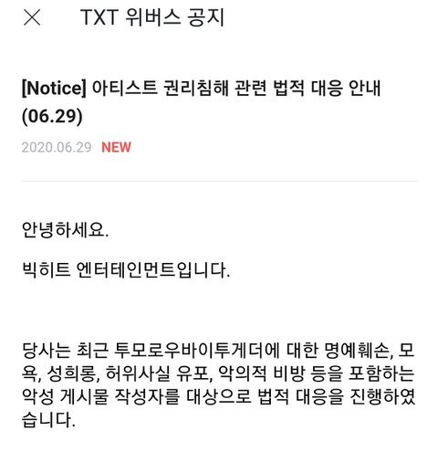 고소 ㅈㄴ 잘함 판녀들이면 빅히트 고소공지도 많이 봤을거고 가끔 빅히트한테 고소 당하고 인증글 올라온것도 봤지?? 메일보내면 되게 빨리 보더라 빨리 본다고 빨리 고소장 날라오는건 아닌데 워낙 고소할게 많아서 시간이 걸리는거지 글 지워도 몇 달 동안은 마음 졸여야 할거야 그리고 고소공지 올라올때만 고소하는거 아니야 아래는 투바투 고소공진데 고소 다 멕이고 올림 그니까 항상 조심 좀 해