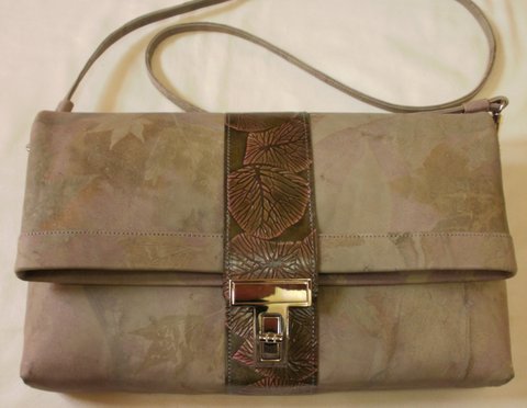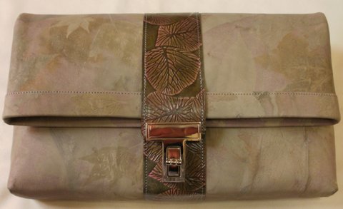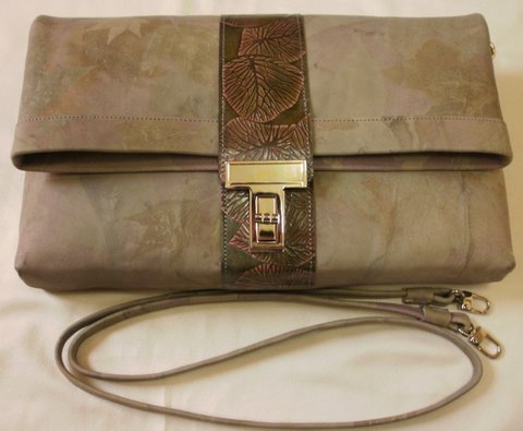 가죽을 천연염색하고 나뭇잎 디자인을 엠보싱하여 염색한 베지터블 가죽과 콜라보하여 제작한 클러치백입니다.(마디샤-대구가죽공예-가죽공예 강좌 및 주문제작