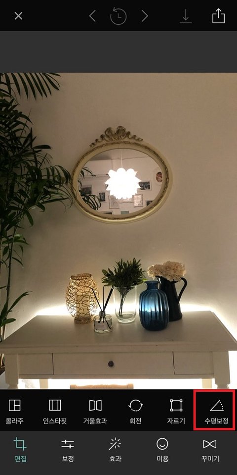 수평보정은 편집 메뉴 중 [편집] - [수평보정] 에서 할 수 있음