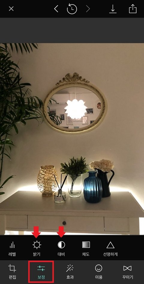 메뉴 중 [보정]에서 [밝기]랑 [대비] 부분만 살짝씩 수치 조절해주면 됨
