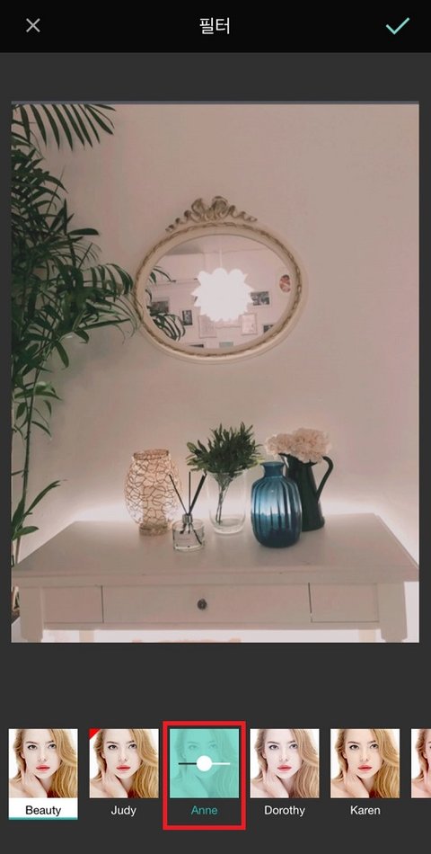 편집 메뉴 중 [효과] - [필터] 에서 Beauty 필터 중 >>> Anne <<< 이 필터 썼어요.