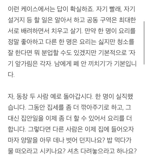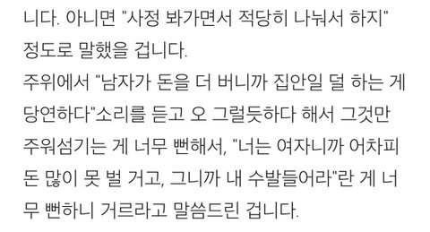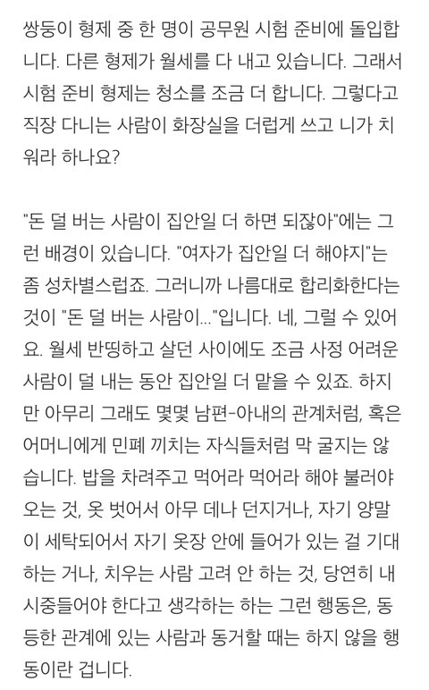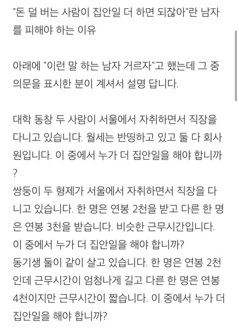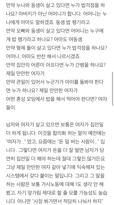 저기서 만약 여자가 돈을 더 벌어오면 덜 힘든 일하는 사람이 집안일 하라고 하죠......결국 여자한테 어떻게든지 집안일 프레임을 씌우는거에요.