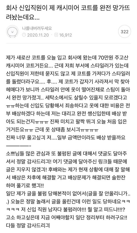주작 어서오고ㅋㅋ 애초에 스타일러에 코트 돌린다고 안 망가짐 타커뮤에선 엘지 스타일러가 업계 원탑이니까 스타일러 이미지에 흠집내려고 역바이럴 돌린거란 소리도 있던데 신입 성별 일부러 바꾼것도 그렇고 걍 개븅딱같음