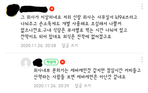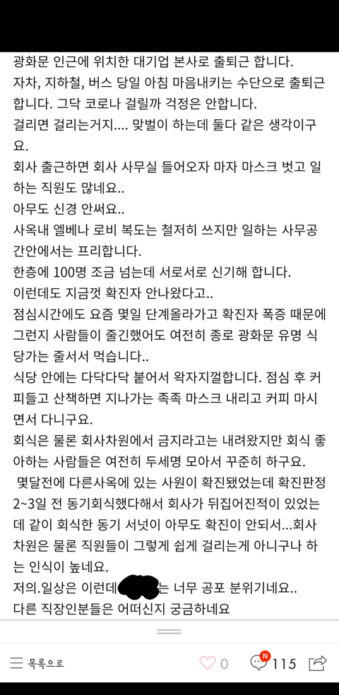 미친 얼마나 허술한 회사를 다니면 저래. 광화문에 몇천명 다니는 회사 직원인데 우리회사는 개살벌함. 사무실에서도 마스크 꼭 쓰게 하고 점심 외부 식당이용도 금지. 구내식당에도 당연히 모두 칸막이 쳐져있고 대화도 금지 시킴. 아오썅 내일부터 어린이집에도 웬만하면 보내지 말라고 공문와서 안그래도 골치아파 죽겠는데 개 빡치네. 저런 ㄴ들 때문에 끝나겠냐고.
