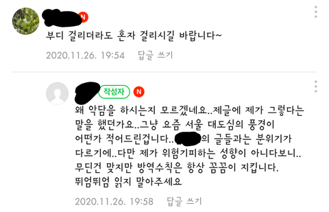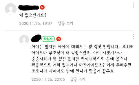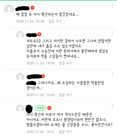 저 작성자는 무증상 감염에 대해서 못들어본 모양이네요. 검사 받아서 확인하지 않는한 무증상 감염자일지 비감염자일지 확신할수 없고, 만에하나 내가 무증상 감염자인데 모르고 다니다가 옮기게 되면 누군가는 사경을 헤맬수도 있으니 서로 조심하고 있는건데, 저 작성자는 자신이 밀접 접촉자도 아니고, 동선도 겹치지 않고 증상도 없으니 비감염자라고만 생각하는가 봅니다. 생각이 저렇게 밖에 미치지 않는데 어떻게 직장생활을 하고 결혼을 하는지 신기할 다름입니다.