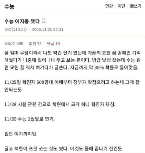 수능 연기는 뭐고 북한 포탄은 또 뭐야 ㅠㅠㅜ 저 글 11/21에 쓴건데 벌써 확진자 500 맞춤