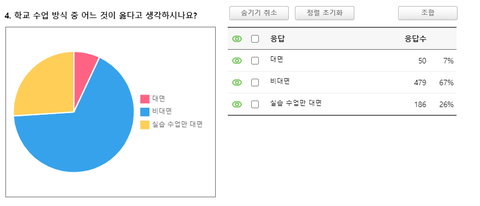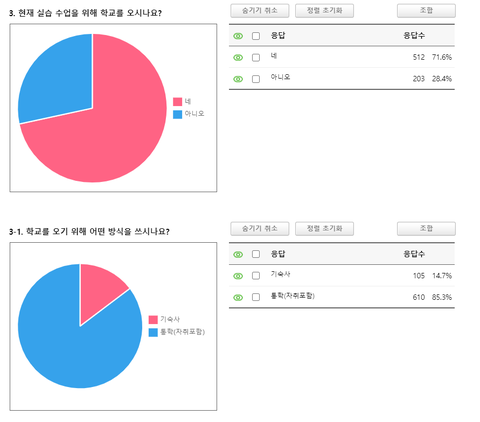 수업을 위해 학교에 온다는 비율이 71.6%, 그 중 기숙사 사용이 14.7%, 통학 버스 및 자취가 85.3%로 많은 학생들이 학교에 등교하고 있습니다.