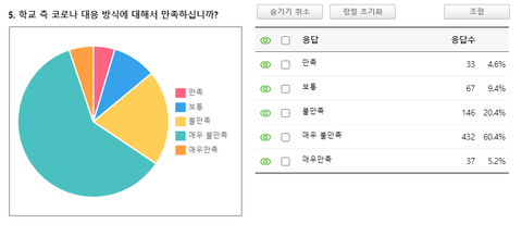 학교 측 현 코로나 대응 방식에 80.8%의 학생이 불만족, 매우 불만족으로 답하셨습니다. 이는 학생들의 의견반영이 전혀 되지 않고 있다는 것을 입증합니다. 또한, 학생을 대변해 목소리를 내어야 할 총학생회도 약 68.8%가 대표하지 않는다고 생각하고 있습니다.