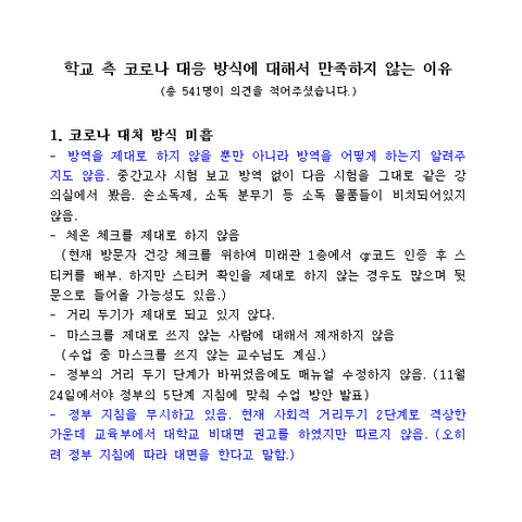 저희 학교는 정부에서 공지한 사회적 거리두기에서 2.5단계가 되어야 일부 비대면, 3단계가 되어야 전면 비대면 수업을 고집하고 있습니다. 학생들은 기숙사를 사용하고 있고, 창문이 없는 통학버스(거리두기 없음)를 타고 등교합니다. 또한, 통학을 하는 학생들의 거주지는 코로나 19가 심각한 서울, 경기, 인천에 속합니다.