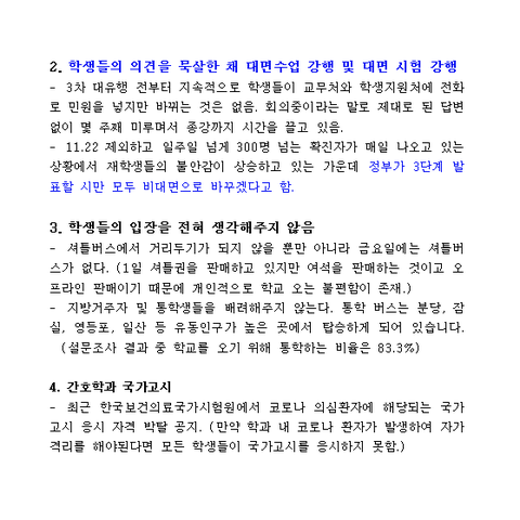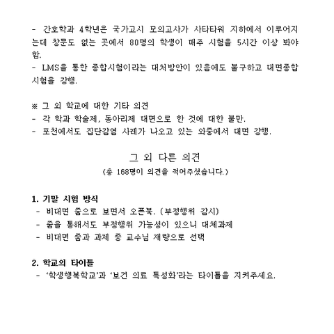 * 그 외에 저희 대학의 간호학과는 국가고시 원칙이 코로나 의심 환자에 대해 응시 자격 박탈임에도 불구하고 학교 측의 위험한 대면 진행에 불안감을 사고 있습니다. 80명의 학생이 건물 지하에서 시험을 보게 되는데 매주 시험을 5시간 봐야 합니다. LMS를 통한 종합시험이라는 대처방안이 있음에도 대면 종합 시험을 강행합니다.