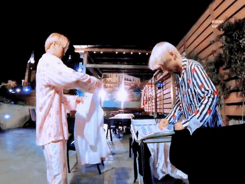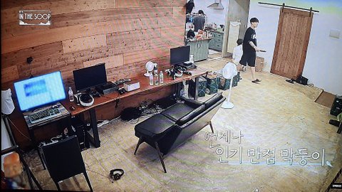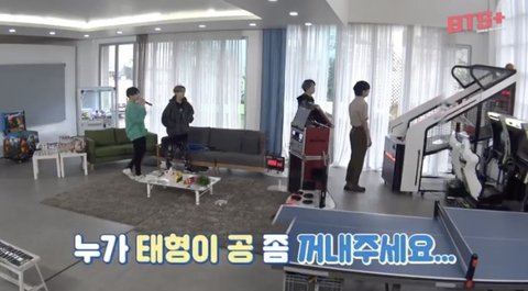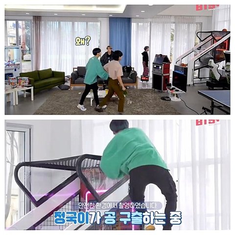 농구공 구조물 위로 올라가니 노래부르는 정국이 끌고가는 태형이