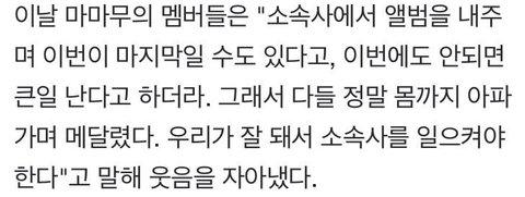 마마무가 옥탑방 살때 환경이 안좋다보니 이유없이 아프고 그래서 서러웠다고 얘기하기도 함
